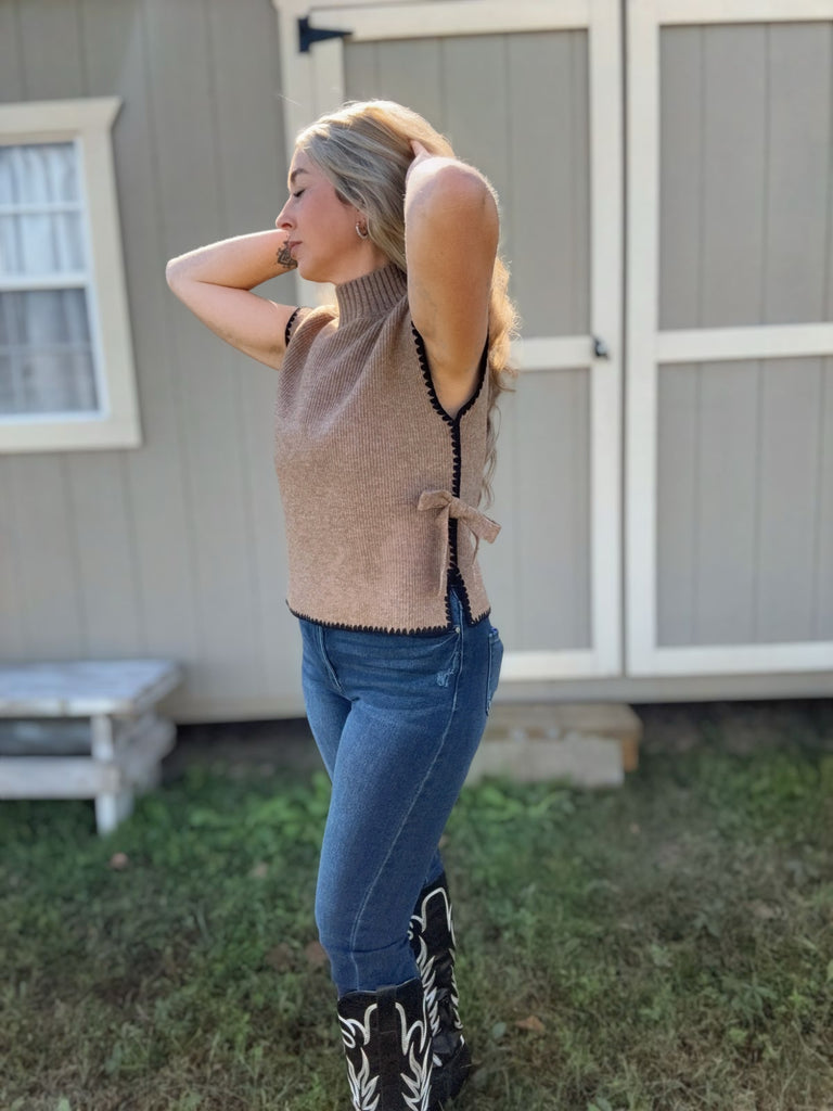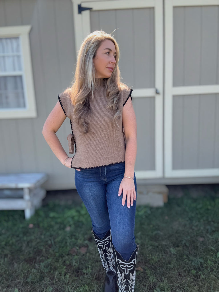 Guaranteed to look cute in our side tie sweater top! Featuring a mock neck, contrast stitch and side ties.