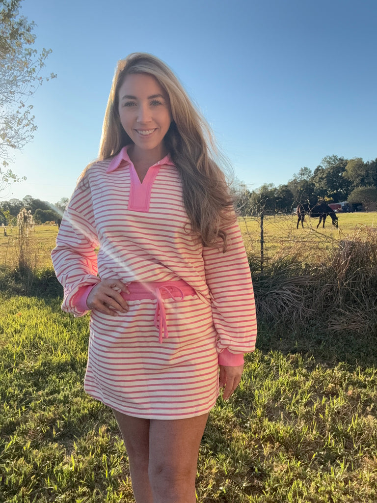 Take a trip in this versatile striped pullover and skort set. The chic collared v-neck adds a touch of sophistication. A comfortable fashion statement for any wardrobe.