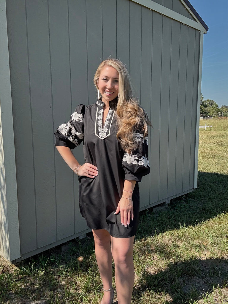 Feel luxurious in this solid 3/4 puff sleeve mini dress with gathered sleeve openings. Featuring contrast embroidery along the split neckline, collar and sleeves. Side pockets. Lined. Woven. Non-sheer. Lightweight.